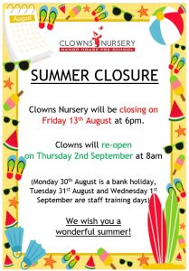 Clowns will be closing on Friday 13th August at 6pm and will re-open to staff and parents Thursday 2nd September at 8am.